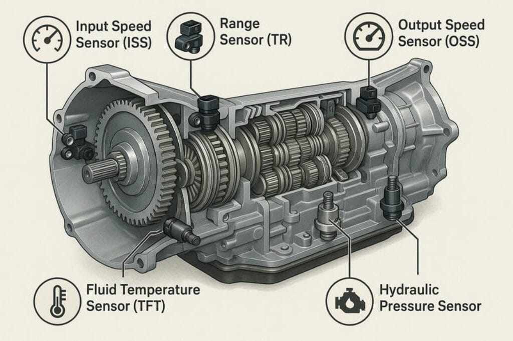 ECU phát hiện tín hiệu bất thường từ cảm biến, chẳng hạn như dữ liệu sai lệch từ cảm biến tốc độ trục vào (ISS), trục ra (OSS) hoặc cảm biến nhiệt độ dầu.
